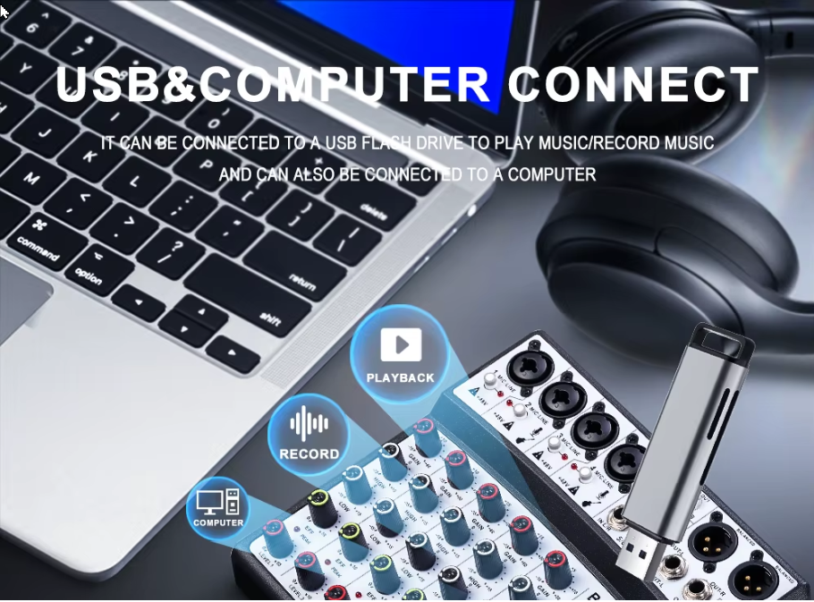 Conexão sem fio Bluetooth5.0: Este mixer permite que os usuários transmitam música sem fio de teclado, telefone e computador para mixar músicas.Possui controle integrado como reproduzir/pausar/trocar músicas e modos.