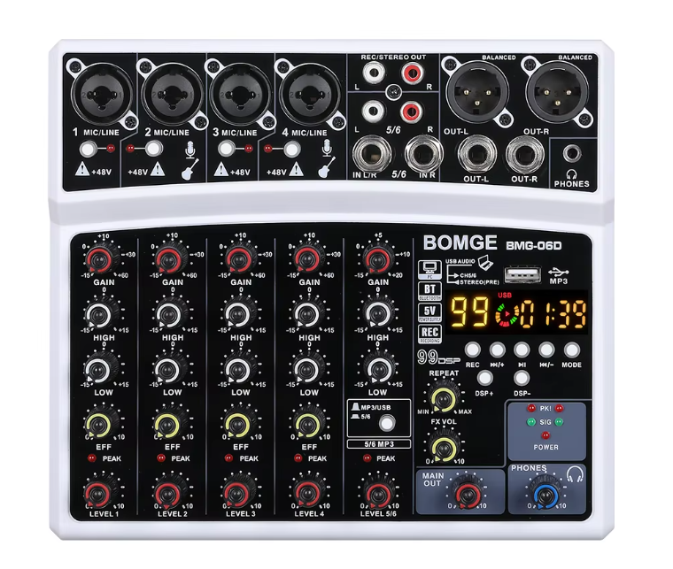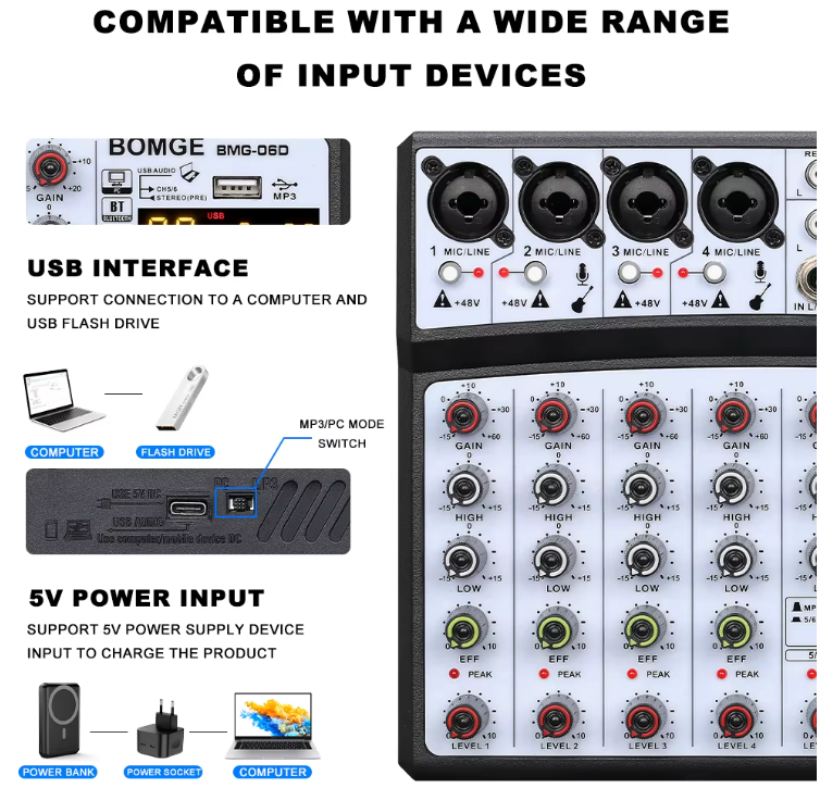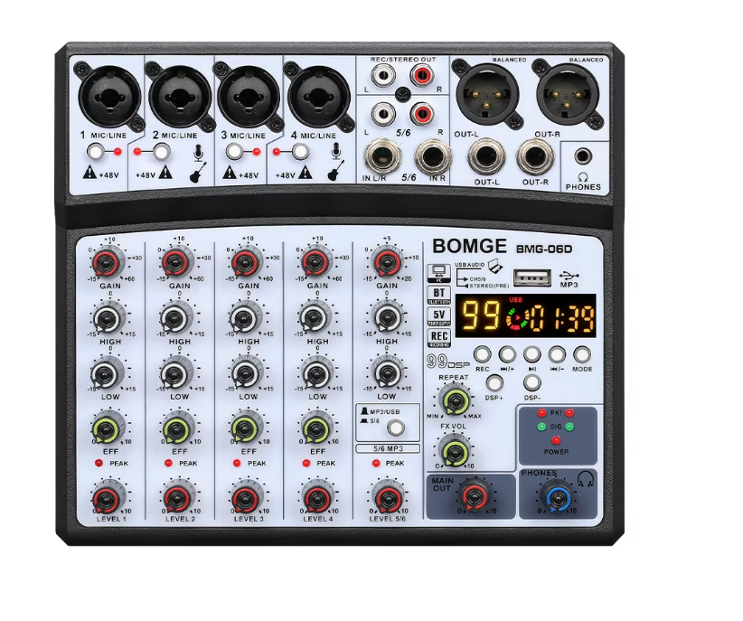 Entrada de 6 canais: O BOMGE 06D inclui 4 entradas mono, suportando plugues XLR e 1/4'' não balanceados, com alimentação fantasma independente de 48V; 2 conjuntos de entradas estéreo: RCA, 6,35 mm /JACK; e entrada USB/Bluetooth com soquetes XLR e RCA de 6,3 mm para conectar diferentes dispositivos.Como microfones dinâmicos, condensadores, receptores de microfone sem fio, guitarras e outros instrumentos musicais, etc.